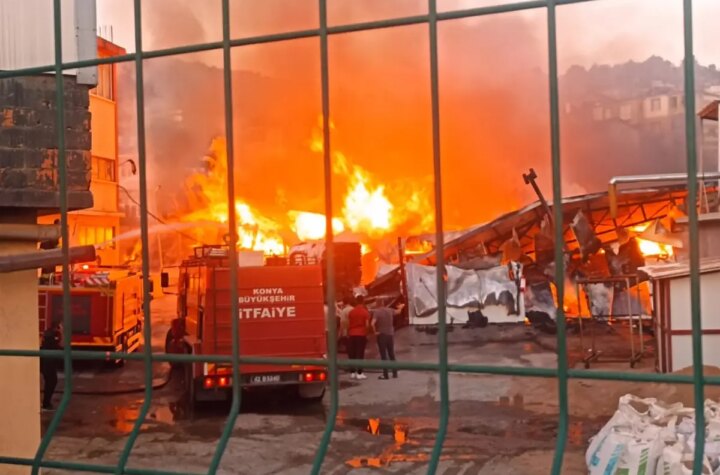 Konya'nın Beyşehir ilçesindeki silah fabrikasının bitişiğindeki kundak atölyesinde çıkan yangın, itfaiye grupları tarafından denetim...