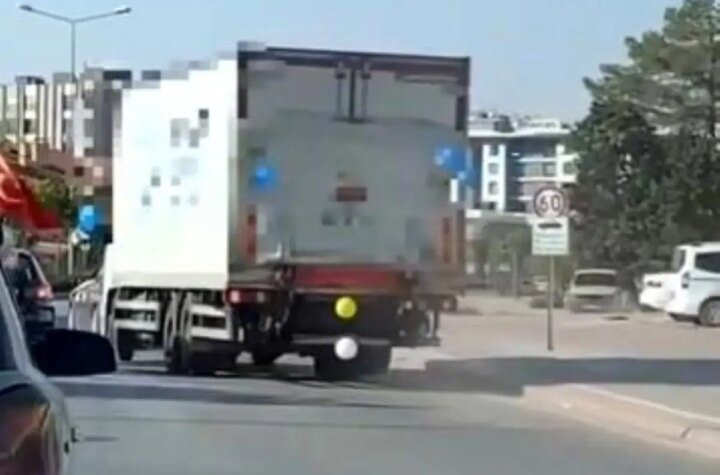 Konya'da ağır trafikte seyir halindeki balonlarla süslü kamyon, kaldırıma çıkarak ve araçların önünde zikzak...