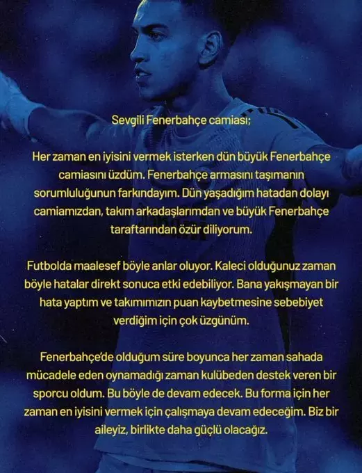 Her vakit en düzgününü vermek isterken dün büyük Fenerbahçe topluluğunu üzdüm. Fenerbahçe armasını taşımanın sorumluluğunun farkındayım. Dün yaşadığım yanlıştan ötürü topluluğumuzdan, ekip arkadaşlarımdan ve büyük Fenerbahçe taraftarından özür diliyorum.