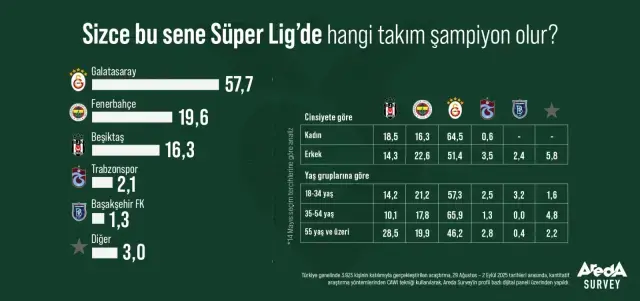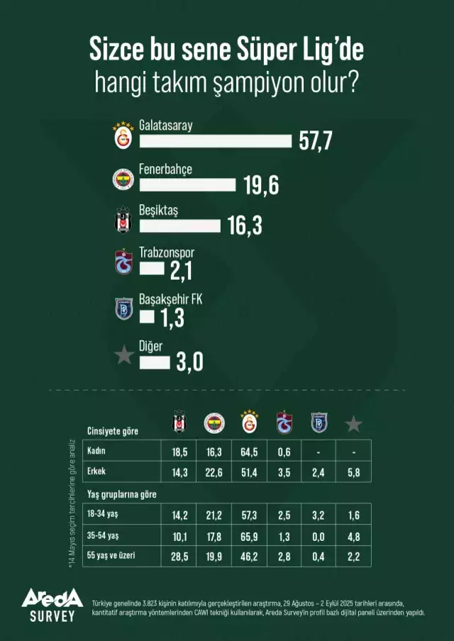 Areda Survey’in 29 Ağustos-2 Eylül 2025 tarihleri ortasında 3.823 bireyle yaptığı araştırmaya nazaran, kamuoyunun Süper Lig şampiyonluğu için en güçlü adayı yüzde 57,7 ile Galatasaray oldu. Galatasaray hem bayanların (yüzde 64,5) hem de erkeklerin (yüzde 51,4) favorisi oldu. Yaş kümelerine nazaran ise Galatasaray’a en düşük takviye 55 yaş ve üzerinden geldi.