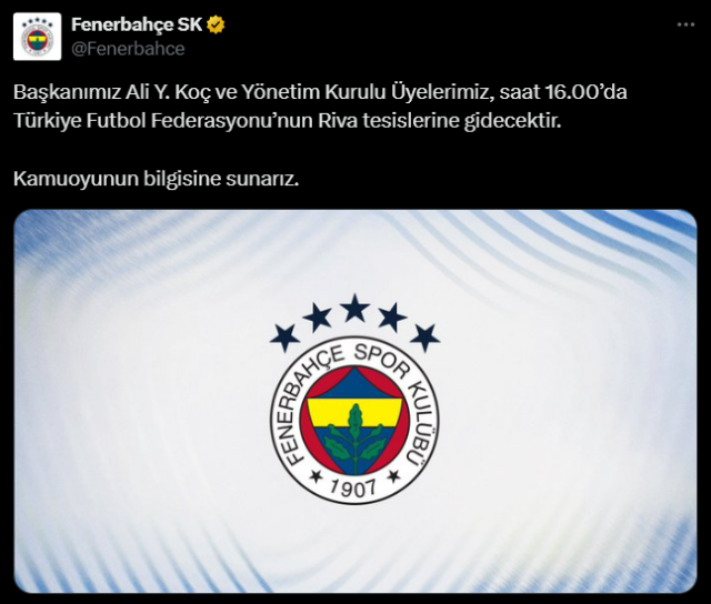 Sarı lacivertli kulüpten yapılan açıklamada, “Başkanımız Ali Y. Koç ve Yönetim Kurulu Üyelerimiz, saat 16.00’da Türkiye Futbol Federasyonu’nun Riva tesislerine gidecektir” tabirleri yer aldı.